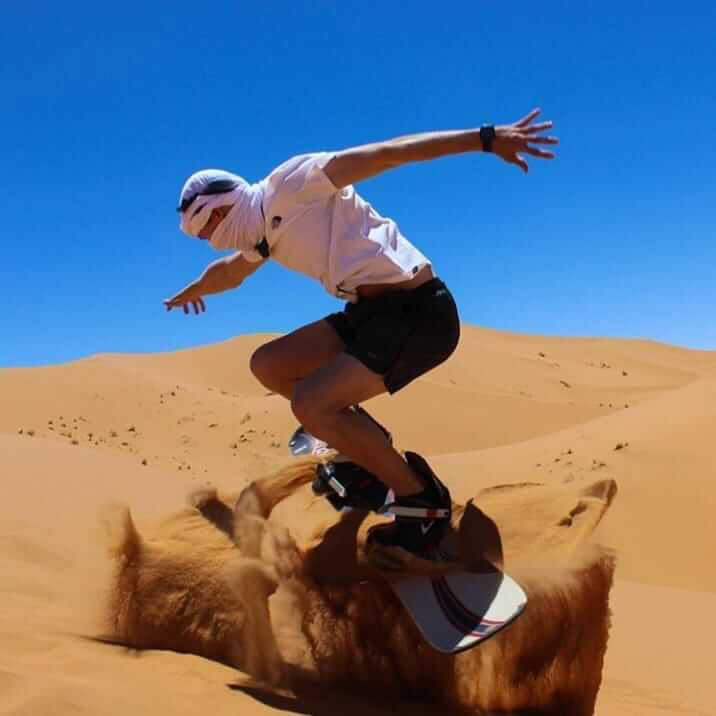 Experience the Sahara desert and enjoy Tailored Morocco Tours Sandboarding in Merzouga at the largest high sand dunes of Erg Chebbi. Sandboarding Merzouga is a board sport that involves riding across or down dunes while standing with both feet attached to a board.